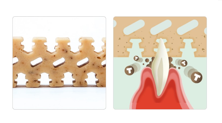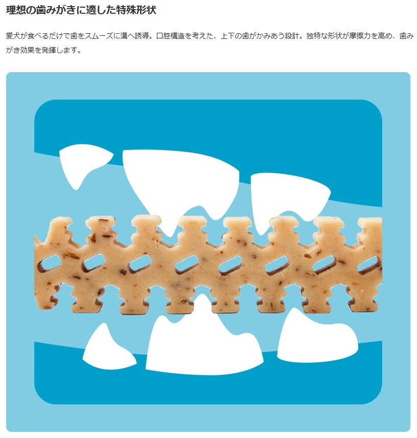 ・ペット(愛犬)がデンティ・スリーフェアリーを食べるだけで、歯をスムーズに溝へ誘導します。