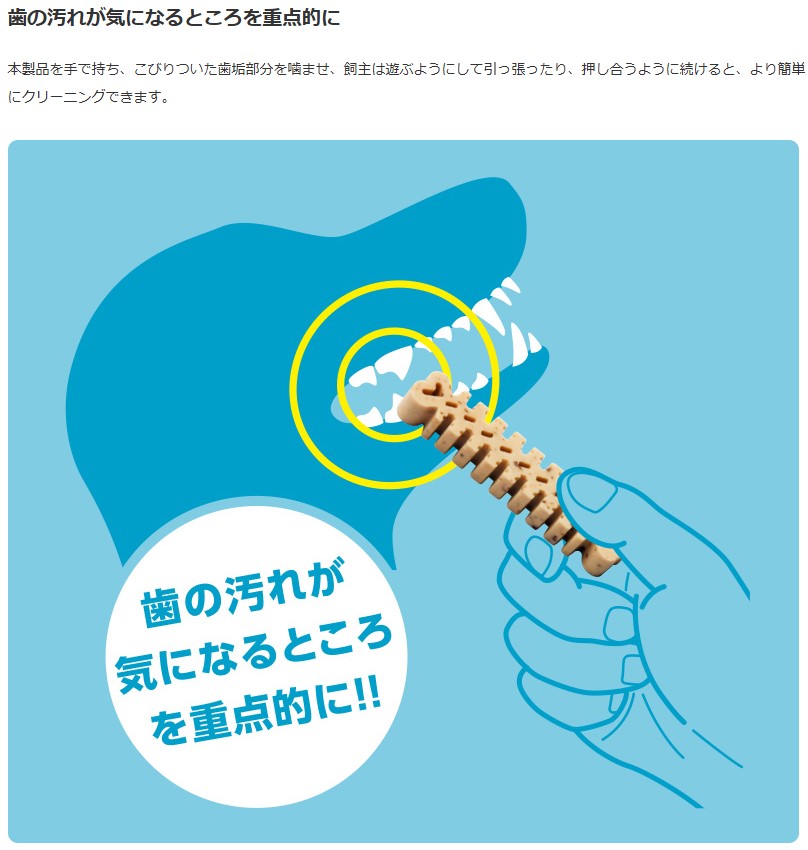 ●こびりついた歯垢部分を重点的に除去したい時は、その部分を噛ませ、飼主は遊ぶようにして手で引っ張ったり、押し合うように続けると、より簡単に除去しやすくなります。
